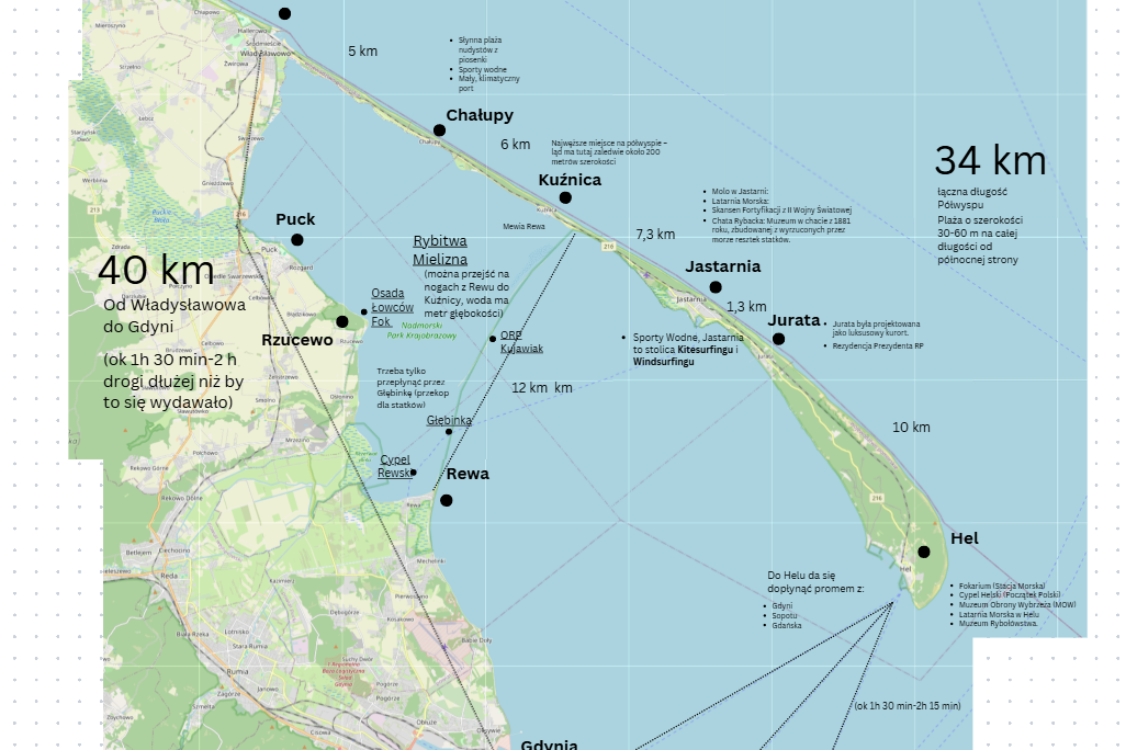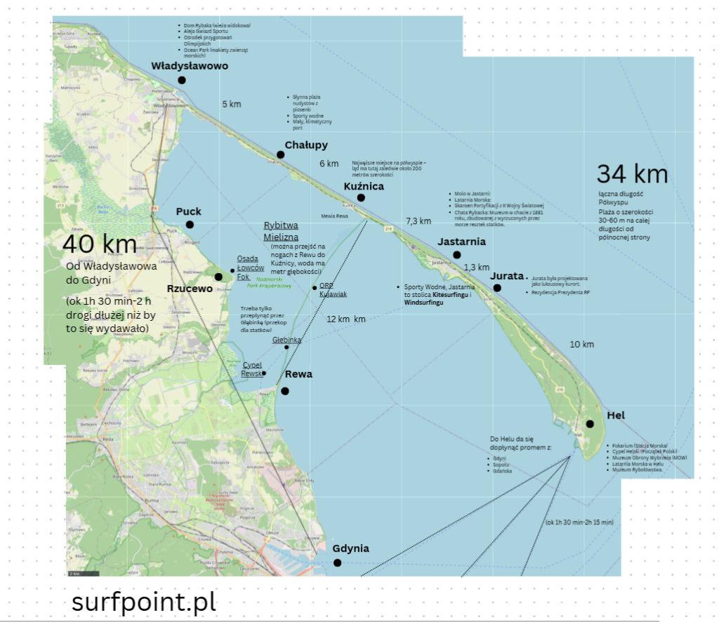 Co jest o tyle zabawne, że półwysep Helski przypomina swoją budową konstrukcje cepa. Jeśli jedziesz od strony Trójmiasta, wjeżdżasz na półwysep przez Władysławowo, a potem miejscowości układają się jak paciorki na sznurku: Chałupy, Kuźnica, Jastarnia, Jurata i na końcu miasto Hel. To ważne, bo każda z nich ma inny rytm, inną skalę, inną „temperaturę” sezonu.