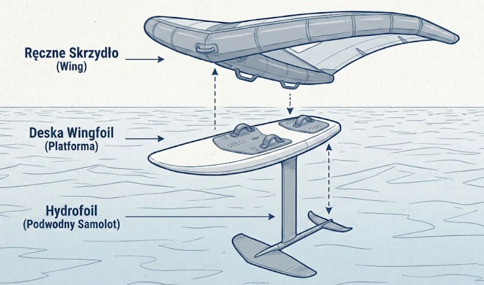 Zestaw do wingfoila charakteryzuje się modułowością i relatywnym minimalizmem. Składa się z trzech niezależnych, ale współpracujących ze sobą elementów: