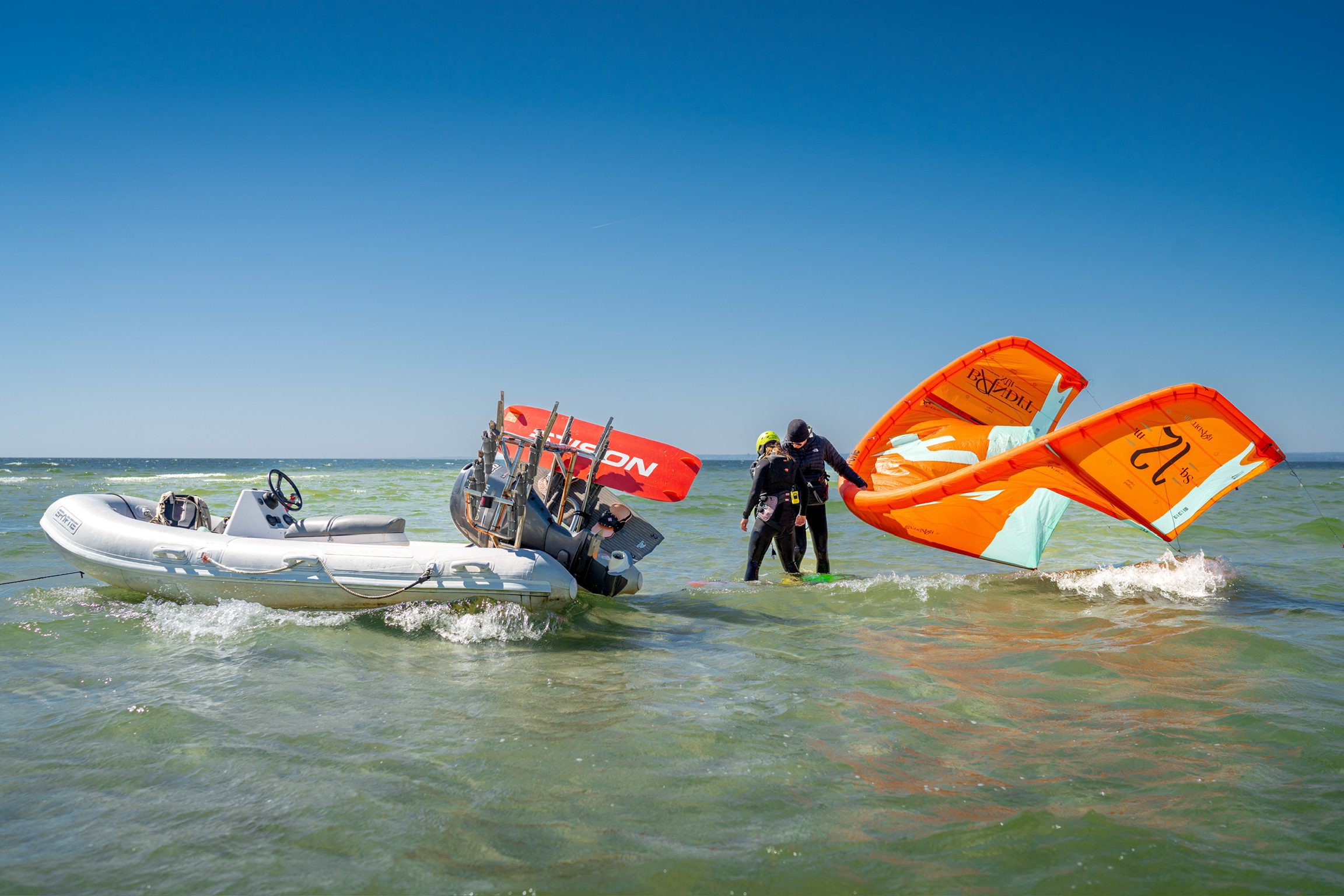 W przypadku tego typu wiatrów, które na Półwyspie wieją "off shore" (od brzegu) ucząc się w SurfPoint nie będziesz musiał jeździć autem na własną rękę w korkach na drugą stronę Zatoki Puckiej. Komfortowo podjeżdżamy sobie jednym z naszych 3 RIBów spod samej szkoły na płyciznę oddaloną od nas o 5-10 minut rejsu 🙂