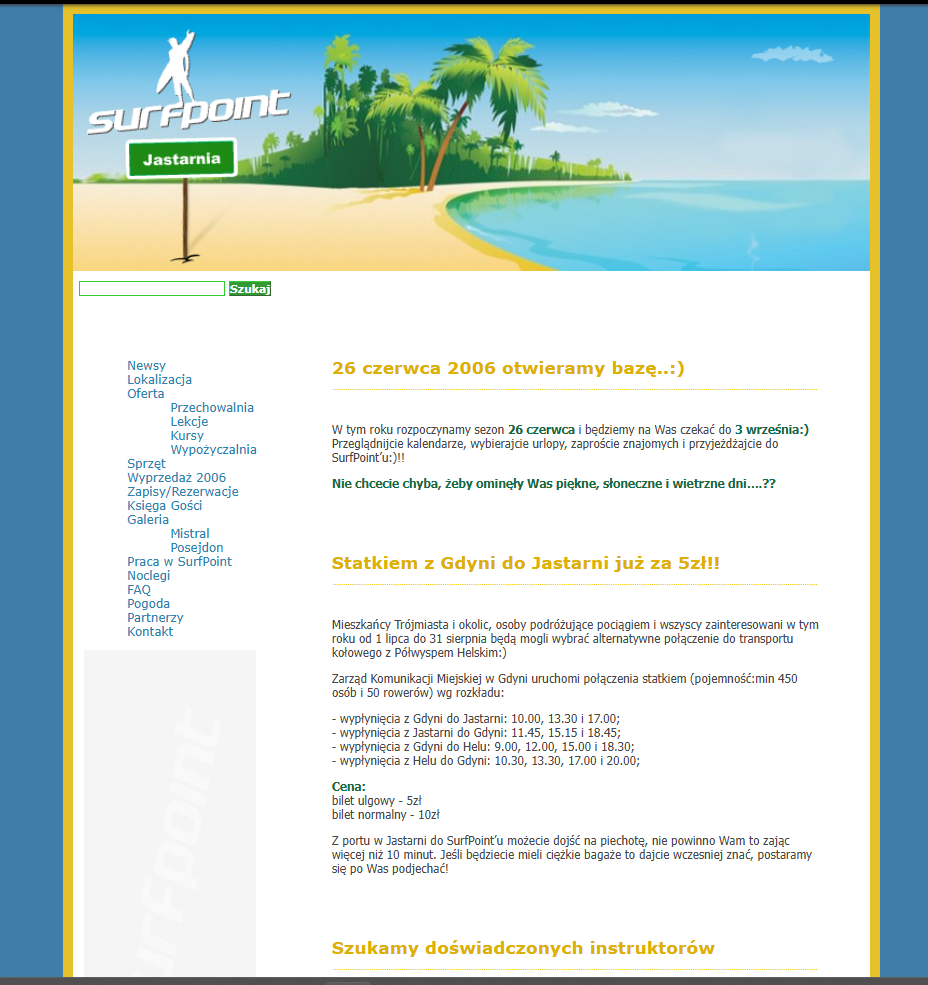 Nadarzyła się okazja, zmienił się Zarządca ośrodka Posejdon w Jastarni i wygraliśmy przetarg. Z uzbieranych przez całą „młodość” przy pracach dorywczych pieniędzy i pożyczki od rodziców wystarczyło nam na 1 ratę na zakup 12 pierwszych desek i 20 pędników. Opłaciliśmy nawet mały baner reklamowy na windsurfingowym portalu:) Pożyczyliśmy też od rodziców Doriana poloneza i pełni zapału ruszyliśmy nad morze… Wtedy jeszcze nie wiedzieliśmy że SurfPoint stanie się naszym całym życiem na kolejne 10 lat! Nie mieliśmy pieniędzy na budowę bazy, w Katowicach przytrzymywała nas sesja na pierwszym roku na Uniwersytetcie Ekonomicznym, więc pierwsza drewniana wiata powstała mniej więcej w 1/3 sezonu (dzięki głównie Krzyśkowi Zdancewiczowi;) Początkowo w szkole uczyło łącznie z Dorianem (instruktor VDWS) 3 instruktorów. Jednym z instruktorów był Piotrek Świtaj, który do tej pory jest z nami i na pewno kojarzycie go jeśli uczycie się w Bazie Posejdon:)